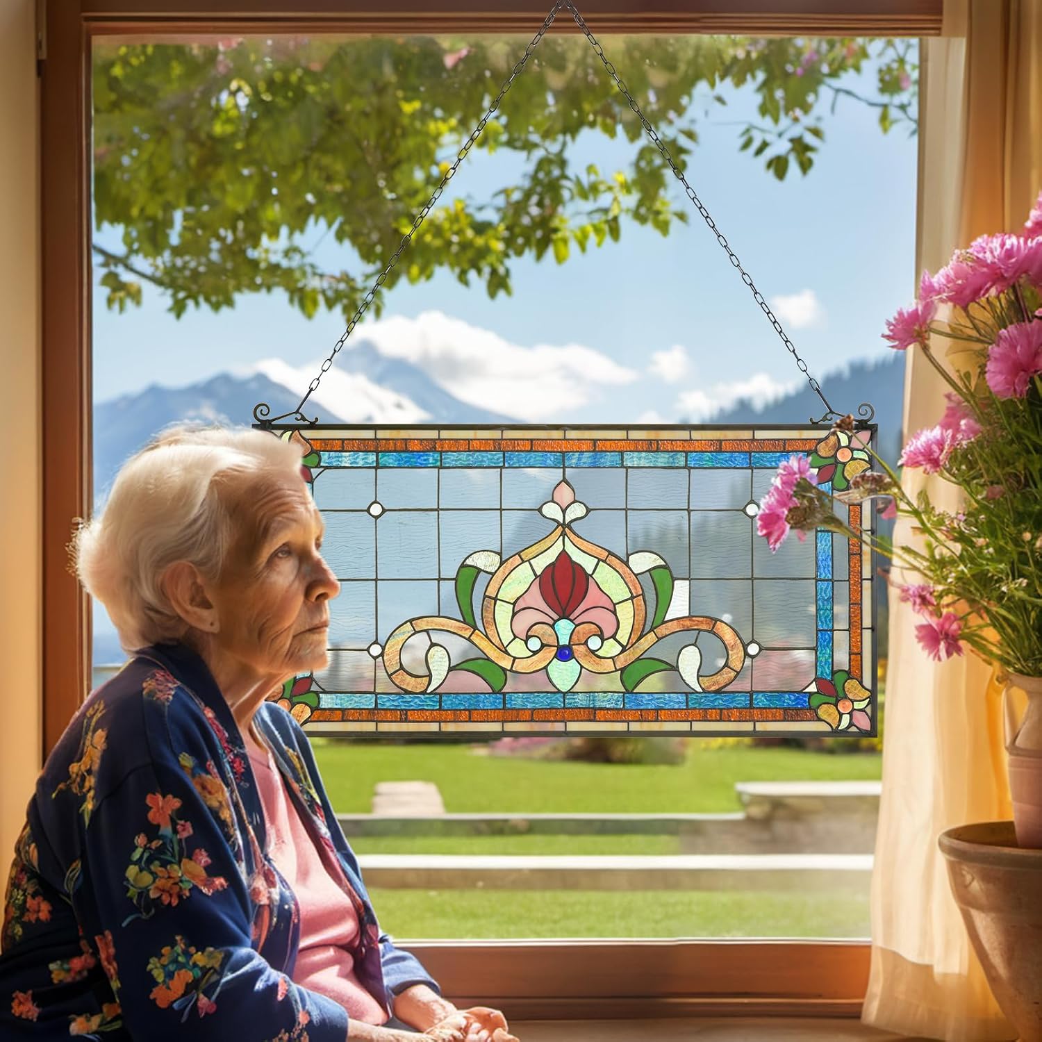 Capulina sunflower handcrafted stained glass window panel is slight heavy than you expected, because it is made of real stained glass, not a plastic shade. The color will never fade. This Stained glass birds window hangings is in 20 inches Wide and 20 inches Height, it comes with 33 inches long chain. Hanging is easy, it hanged by chain with a hook The stained glass birds window hanging panel was 100% handcrafted with top quality materials including real stained glass and gem-like cabochons. This birds and flowers stained glass hanging panel is really a beautiful work of art. Design with two birds stand two side of the sunflower, vividly presents the frolicking of birds and flowers. This stained glass art panels is marveled every time when the sunshine comes through window. Because of the stained glass's opacity, when light is illuminated from behind, the stained glass is given activity and life. When you wake up in the morning, the sun shines through the birds and flowers stained glass, which makes the stained glass as if there is life. It is a wonderful way to enjoy the morning sun! Beautiful flower and bird window hangings, handcraft stained glass panel realizes the combination of flower, bird and light, adding luster to your life!