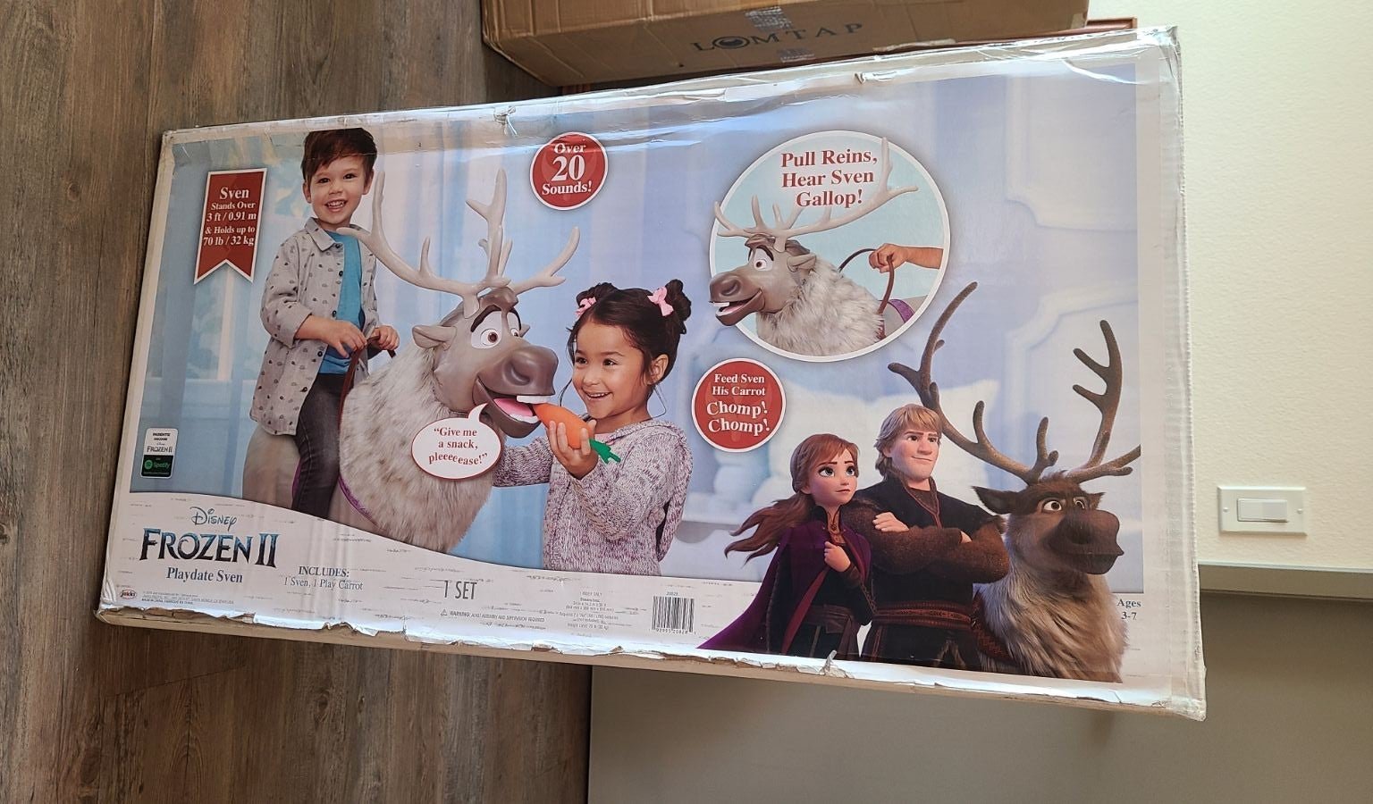 Pull on Sven's reins or pat his head for real galloping sounds and other reindeer noises!Cuddle up to Sven's luxuriously soft faux fur mane